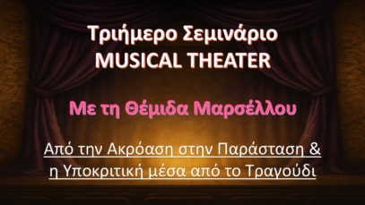 ΣΕΜΙΝΑΡΙΟ MUSICAL THEATER ΜΕ ΤΗ ΘΕΜΙΔΑ ΜΑΡΣΕΛΛΟΥ “Από την Ακρόαση στη Παράσταση & η Υποκριτική μέσα από το Τραγούδι” Σεμινάρια ΣΕΜΙΝΑΡΙΟ MUSICAL 2025 Σεμινάρια ΣΕΜΙΝΑΡΙΟ ΤΕΧΝΙΚΗΣ ΚΑΙ ΕΡΜΗΝΕΙΑΣ TΡΑΓΟΥΔΙΟΥ με τον Πάνο Δήμα, Ιούνιος 2024 Σεμινάρια Songwriting Workshop Γράψε και εσύ το δικό σου τραγούδι Μάιος 2024 Σεμινάρια Βιωματικό εργαστήριο Body Percussion με τον Γιώργο Κασαβέτη, Φεβρουάριος 2024 Σεμινάρια Σεμινάριο Τραγουδιού με τη Γιώτα Νέγκα, Φεβρουάριος-Μάρτιος 2024 Σεμινάρια Η θεωρία της μουσικής: Δραστηριότητες και πρακτικές εφαρμογές με τον Μάριο Σκαμνέλο, Κυριακή 29 Οκτώβρη 2023 Σεμινάρια “Εγώ είμαι η Φωνή μου” με την Μάρω Θεοδωράκη, Σάββατο 4 & Κυριακή 5 Νοέμβρη 2023 Σεμινάρια Εργαστήρι Ρεμπέτικου Τραγουδιού με την Κατερίνα Τσιρίδου, Πέμπτη 18, 25/05 & 01/06 2023 Σεμινάρια